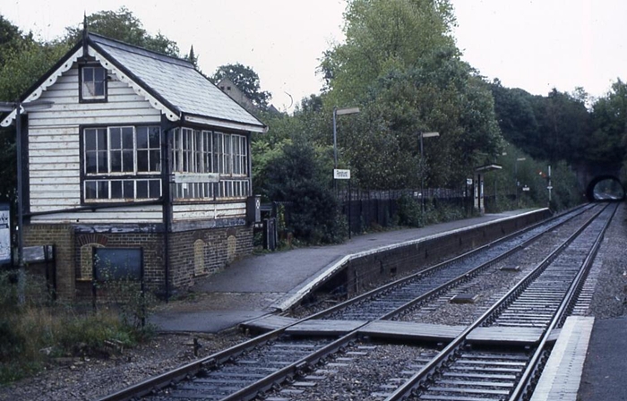 A classic eastward view shows the original staggered ''down'' platform, once reached by the track foot crossing