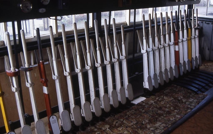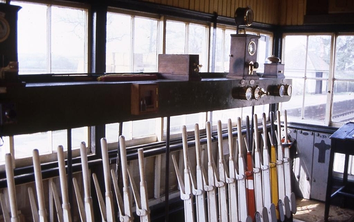 An internal view of the signal box reveals 24 levers. White levers are designated as ''spare'', yellow levers