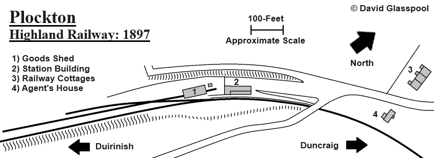 Mr Peter Fraser was the Station Master at Plockton from the outset, and the stations here and at Duirinish were described at the time as being “substantially built and well equipped”, and that the locals highly praised their smart appearance (ref: The Inverness Courier, 2nd November 1897). Plockton station comprised a single platform, and in the 1st September 1897 edition of The Aberdeen Weekly Journal it was reported that consideration was being given to installing a crossing here at a future point in time. The same publication noted that the main station building provided accommodation for First and Third Class passengers “and all the other conveniences which modern requirements demand”. The station building was an attractive single-storey structure formed of vertical timber planks, complete with a slated pitched roof. Of the latter, this overhung the platform to form a canopy supported by five cast-iron stanchions. In January 1897, the Highland Railway Company had also advertised in local newspapers for contractors to build the following at Plockton: an Agent’s house and a block of three dwellings for Porters and Surfacemen. It was specified that the houses needed to be of stone construction with slated roofs and that the building contract did not include plumbing nor painting (ref: The Ross-shire Journal (Ross and Cromarty, Scotland), 22nd January 1897). The houses were reported as being pushed forward with at speed in the 24th April 1897 edition of The Railway Times.