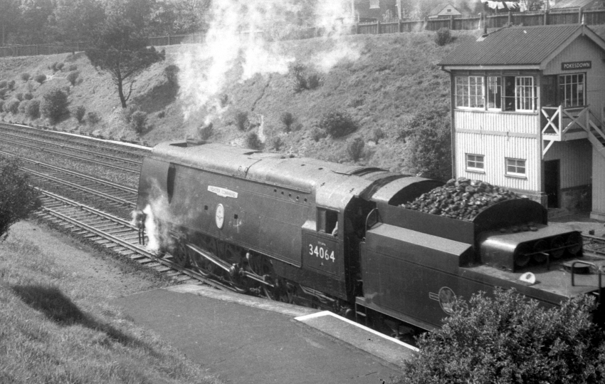 Four tracks and the steel-clad signal box are evident in this view of Unrebuilt Battle of Britain Class No. 34064 ”Fighter Command” — with cut-down tender — departing the “down” platform, Bournemouth-bound. Four tracks also existed at Brockenhurst and Bournemouth Central. © David Glasspool Collection
