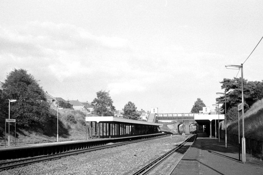 The gap where two tracks were once laid is obvious in this eastward view, which captures the steel-clad canopies and footbridge. The main building is positioned upper right, immediately behind the footbridge tower on that side. © David Glasspool Collection