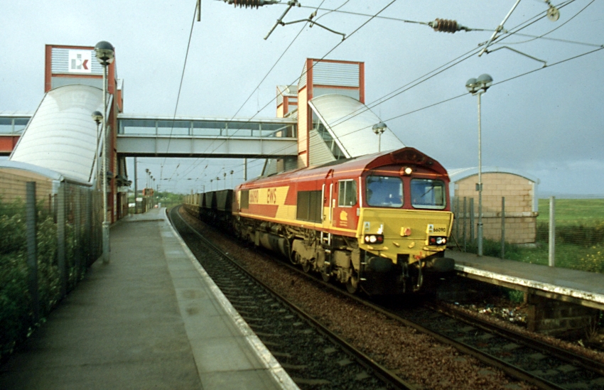 With coal hoppers in tow, Class 66 No. 66090 passes northbound through Prestwick International Airport. On the far left can be seen the continuation of the footbridge, known as “The Skywalk”, that links the station with the airport terminal. Note the “PIK” logo at the top of the footbridge tower on the left. © David Glasspool Collection