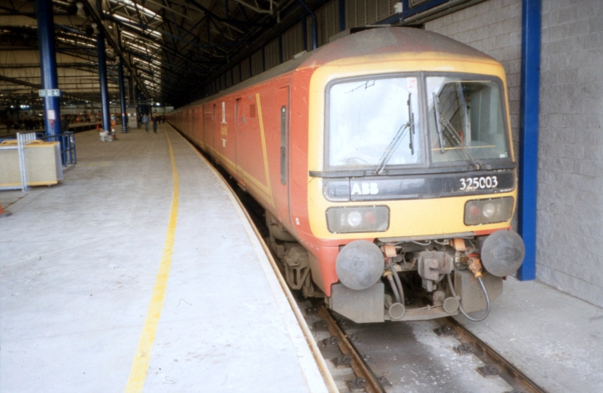 A Class 319 body shell and a Networker cab: the dual voltage Class 325. No. 325003 is seen at the northern-most platform of the cavernous Princess Royal Distribution Depot. Nearly a quarter of a century after this photograph was taken, No. 325003 was still plying the West Coast Main Line, albeit now lacking yellow stripes on either side. The occasion of this photograph was the "Red Nose" rail tour of the "Branch Line Society", which saw Class 313 unit Nos. 313056/057 visit the depot. © David Glasspool Collection