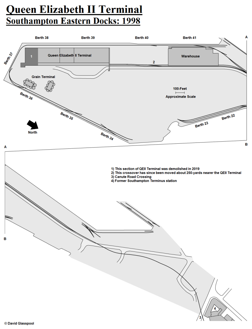 When did the last trains serve the QEII Terminal? Based on your author’s best research efforts, the last genuine boat train appears to have run on 16th October 2012; this was a working from Glasgow Central operated by "Direct Rail Services", formed of the "Blue Pullman" BR Mk 2 air-conditioned stock and hauled by Class 47 Nos. 47828 and 47818. As for the last train in general to pull up alongside the QEII Terminal’s platform, this would appear to have been the "Andover Fist" rail tour, which ran a return trip on 8th April 2017 from Waterloo to Southampton Eastern Docks.