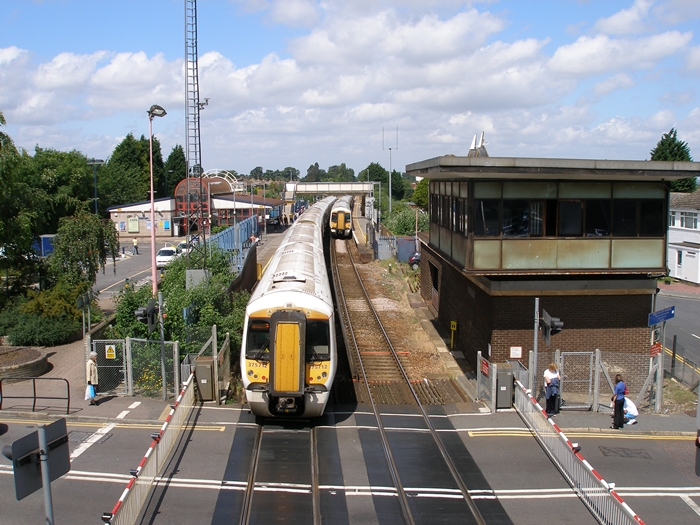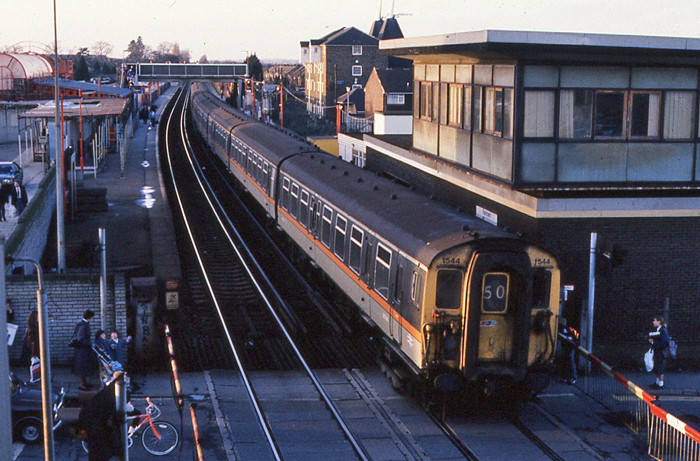 A westward view reveals the replacement station building of 1990 and new rolling stock. Alongside the ''down'' platform is Class 375 No. 375708; trailing on the rear of the London-bound service is No. 375712. At the time of the 1990 rebuild, the CLASP waiting shelters were replaced by fully glazed ''bus'' shelters. © David Glasspool