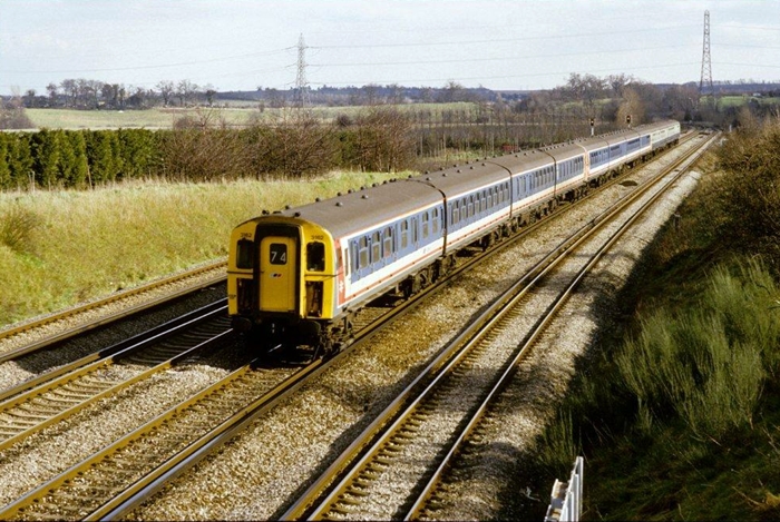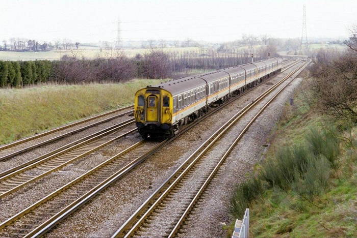 An eight-vehicle ''Jaffa Cake'' formation of two 4-CEP units is seen heading along the quadruple track with a Dover Western Docks to Victoria service. This viewpoint is ¾-mile east of Rainham, taken from the road bridge seen in the background of the first picture on the previous page. © Wayne Walsh