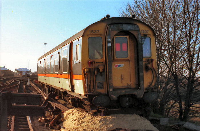 One of 4 CEP unit No. 1537's motor coaches is seen buried up to its axles in the sand drag. It demolished the buffer stops after a shunting move out of No. 29 road went wrong. © John Horton