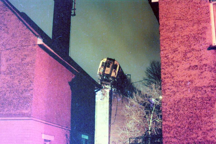 The bright white lights are those of the rescue team, re-railing taking place throughout the night. A further shortening of this siding ensured that never again would a train take to the air! © John Horton