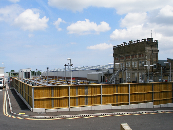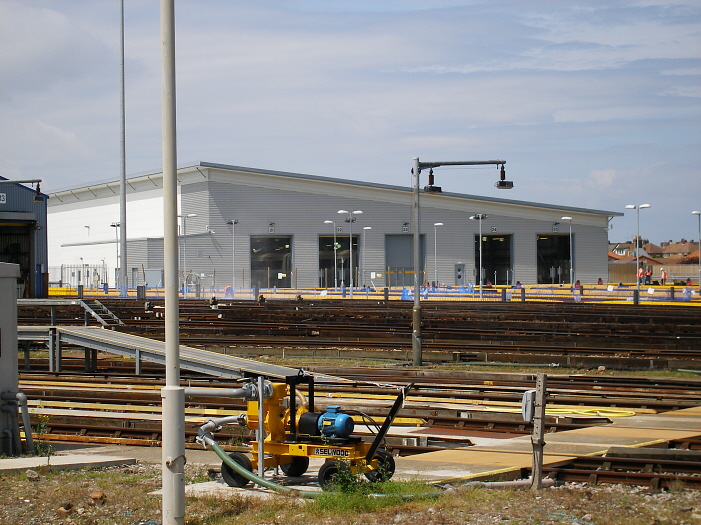 A general three-quarter view shows that the former water tower structure of the engine shed continues to provide office accommodation. The elongated building in the background is the existing EMU maintenance depot, built as part of the Kent Coast Electrification works during 1960, and subsequently re-roofed in 2002. © David Glasspool