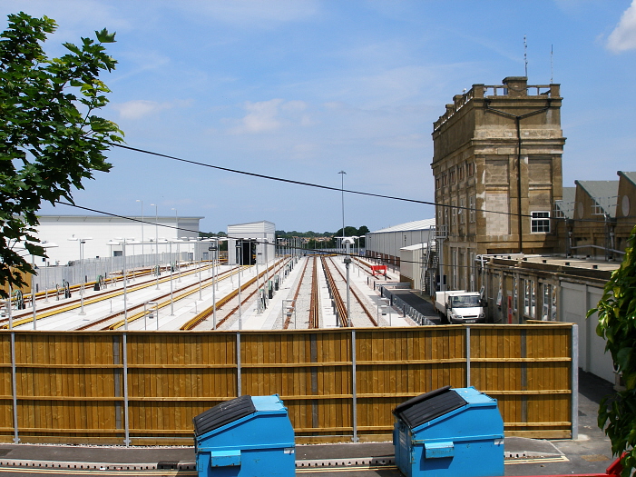 A general view across the western throat of the depot shows the final stages of construction work underway. Sandwiched within the bright yellow boarding are the conductor rails. A Class 375 unit can just be deciphered through the open doorways on the left-hand-side of the building. © David Glasspool