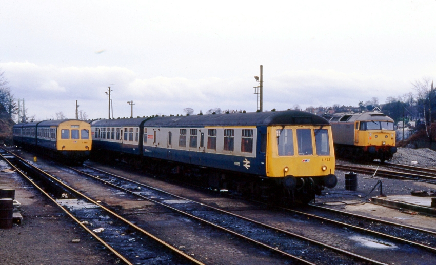 The three tracks formerly covered by the engine shed are seen 25 years later, and by this time were being used to stable the diesel multiple units which operated between Tonbridge and Reading. On the left is Class 101 No. L840 and, to its right, Class 119 No. L573. One of the inspection pits from steam days had survived, to the left of the rolling stock. The Class 47 is upon the siding which once led to the turntable. © David Glasspool Collection