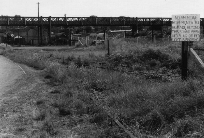 A southward view from 1983 reveals the extent of the lattice footbridge and the amount of overgrowth which had taken hold of the yard by this time. The goods shed can be seen in the background, to the left, whilst the sign in the foreground, to the right, states: ''No shunting movements to be made beyond this board when red flag or red light is showing.'' © Chris