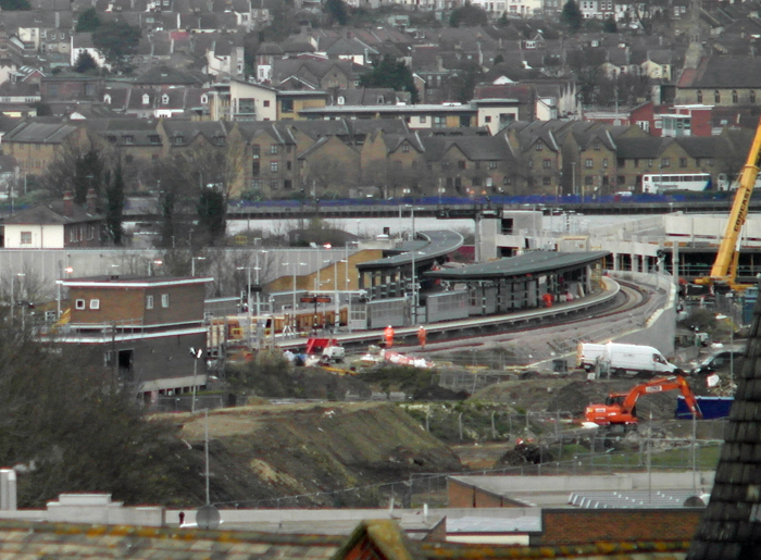 A northward view shows the full extent of the new station, which comprises three platform faces, two of which form an island. The presence of the signal box of 1959 origin, on the left, prevents the use of the outer platform face of the island from the outset, given that it sits on part of the new track alignment. A sizeable multi-storey car park is under construction on the right-hand side. © David Glasspool