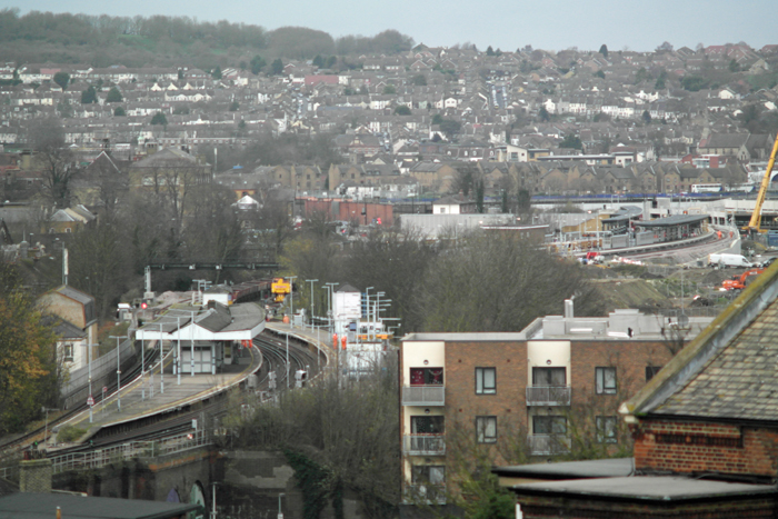 Early signs of construction work were witnessed in November 2013, when temporary fencing was erected around that section of the railway embankment earmarked for the new station. This was quickly followed by vegetation clearance. Major engineering works commenced the following year: a four-day closure of the line between Sole Street and Gillingham was enacted from 02:00 on Friday 18th April 2014 to 03:30 on Tuesday 22nd April 2014. On 18th April, 185-yards north of the signal box, a gap of about 30-feet was cut into the railway embankment. This was in order to accommodate a huge concrete box, which was to provide an underpass link between the town and riverside. The box was moved into position by attaching to it a series of nitrogen-filled jacks, allowing the concrete colossus to be pushed into position upon a cushion of air.