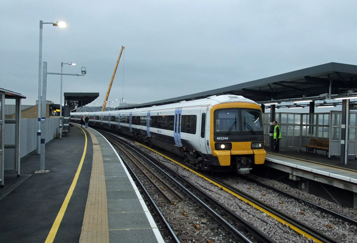 Class 465 No. 465244 is seen arriving with the 09:00 service to Gillingham. The crane in the background is involved in the construction of the multi-storey car park. © Roger Goodrum