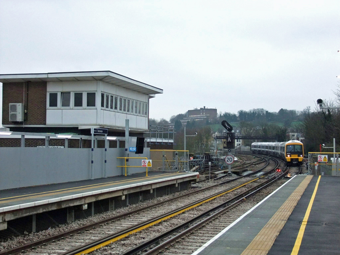 Approaching from the south is Class 466 No. 466040 leading the 08:58 service to Charing Cross. On the left is the 1959 "power box" which, had the resignalling run to the original schedule, would have been demolished in April to allow the completion of the "down" loop. The white crosses on the signals indicate that they are not yet operational. © Roger Goodrum