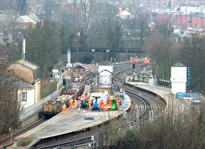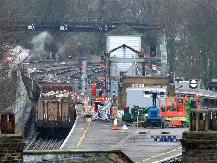 Structures on both platforms have now been decimated, although the lift shafts were just about hanging on at the time of this photograph. The line was under an engineering possession and a Class 66 had arrived with some wagons to be filled with the scrap from the demolition. © Roger Goodrum
