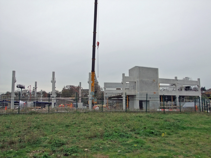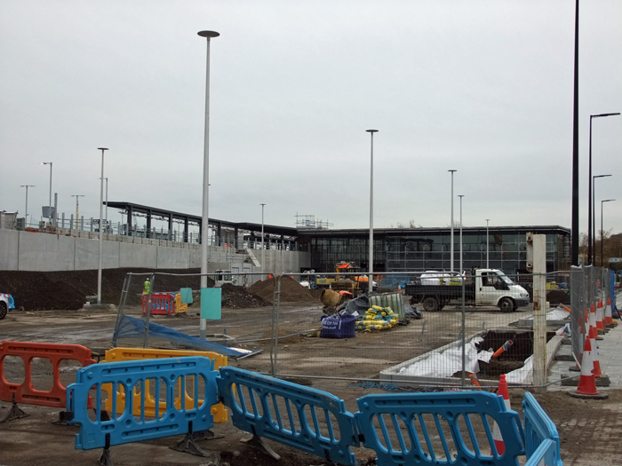 On the opposite side of the railway embankment to the station entrance, the outline of a multi-storey car park has emerged. This will compensate for those car parking spaces lost to the new station development adjacent to "Corporation Street", but it will not be finished until April 2016. © Roger Goodrum