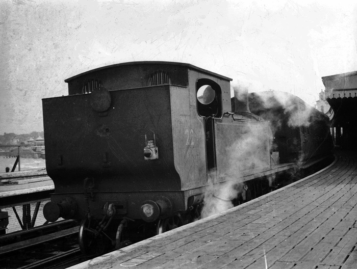''O2'' 0-4-4 Tank Engine No. W22 ''Brading'' is seen at Esplanade, awaiting a bunker-first departure to the Pier