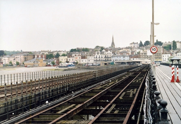 A southward view shows all three piers. From left to right: railway; tramway; and walkway. The origins of the