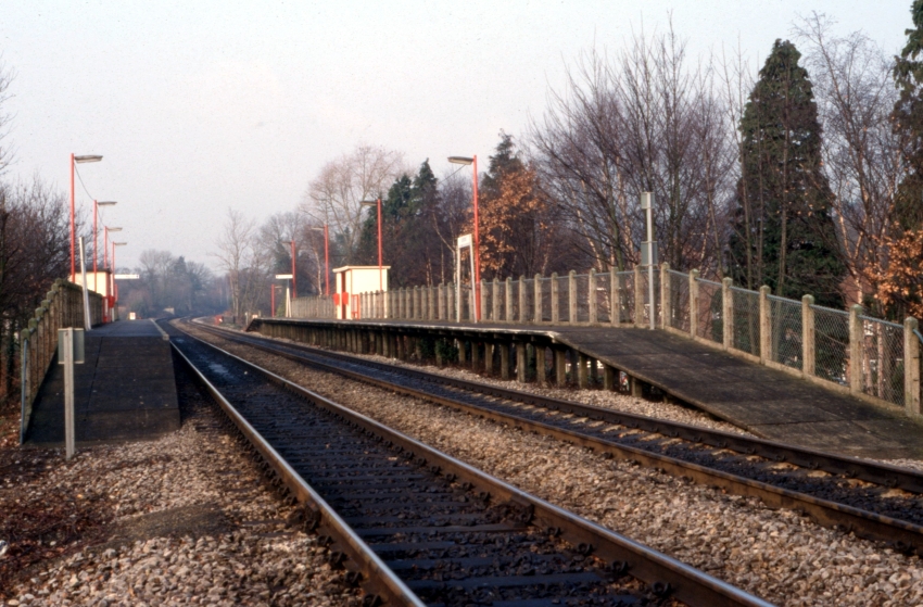 A north westward view towards Reading shows the prefabricated concrete platforms that your author suspects are of Southern Railway origin. Access to each platform is by means of an inclined walkway from street level, located at the opposite end of the station to which this photograph was taken. Since this view, two different waiting shelter variants have appeared here. © David Glasspool Collection