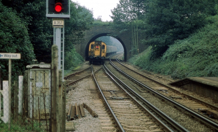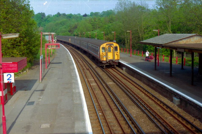 Approaching from the east are 4 CEP units Nos. 1543 and 1511, forming a service to London Charing Cross. On the left can be seen the vividly-painted BR CLASP waiting shelter, which was demolished circa 2006. © John Horton