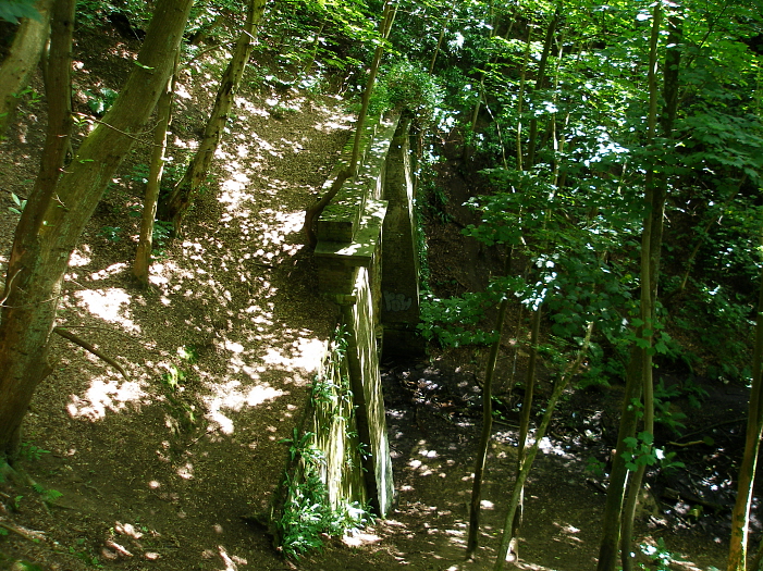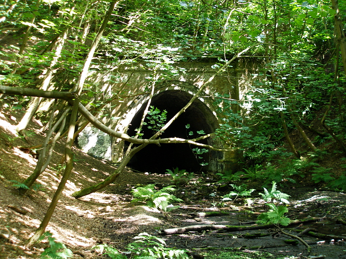 After walking along the track bed for a short time, the disused Hayne Wood Tunnel looms out of vegetation; it is quite a sight to behold. At 94 yards in length, the tunnel has been fortunate in escaping being blocked up, which very much adds to the interest. The tunnel floor was flooded on this day, but it is still possible to walk through the tunnel if one is feeling bold. Alternatively, the footpath ascends on the left-hand side. © David Glasspool