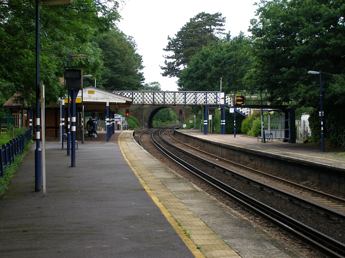 The pictorial now returns to the station, looking at the main line platforms in particular. This westward view shows the remaining Mock Tudor station building on the "up" platform, complete with canopy, and the lattice footbridge, now devoid of roof. The simple triangular canopy design seen here is the same as that which was used on the triangular surface with the branch line platforms, and that which could once be found on the "down" platform. © David Glasspool