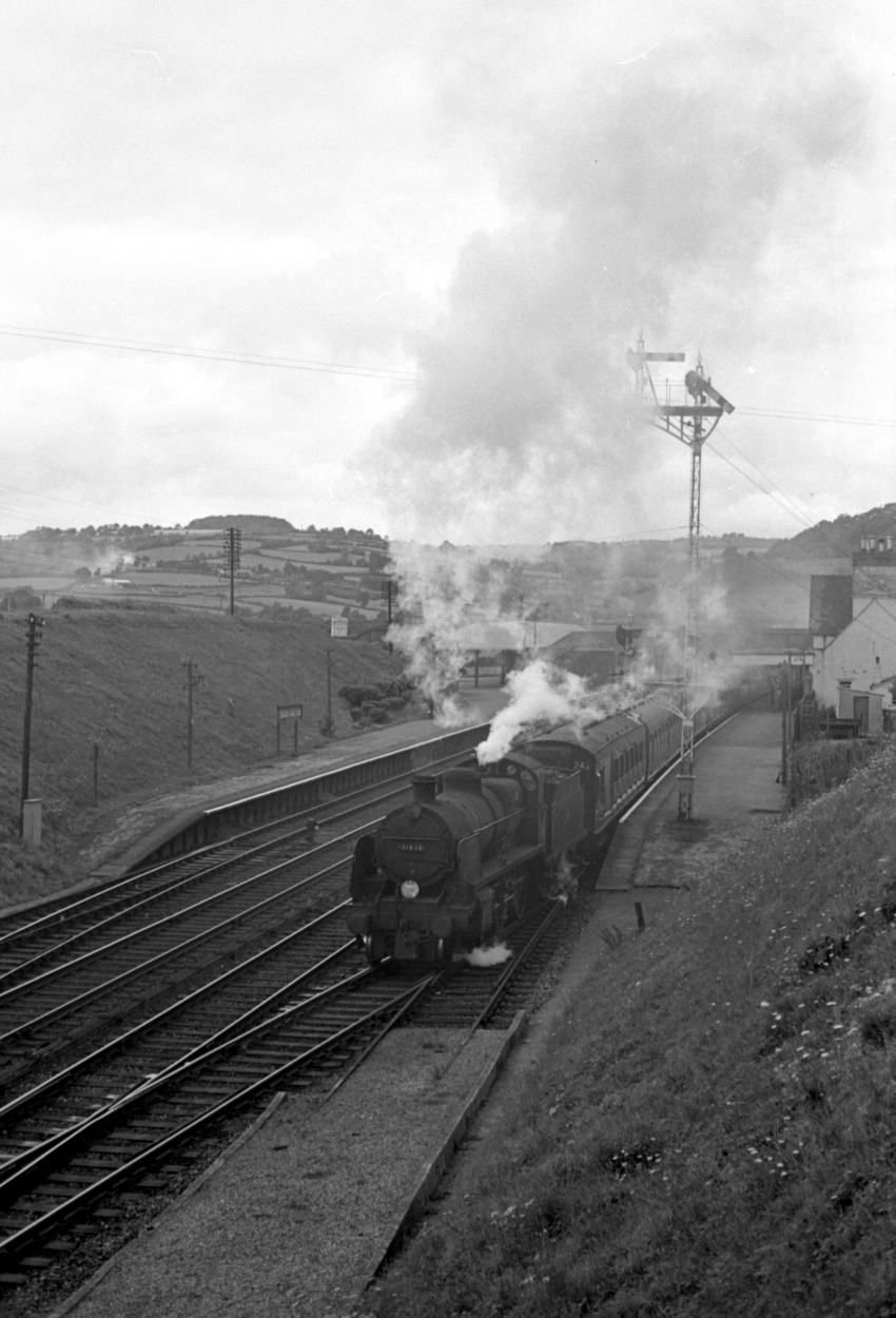 Beginning life as a typical rural stop on the Salisbury to Exeter section of the LSWR’s main line to the south west, this station later developed into an extensive layout tailor-made to the need for fast expresses to overtake stopping services. The site came into use with the single-track Yeovil to Exeter extension on 19th July 1860, being known as ‘’Colyton for Seaton’’ from the outset. Two platforms emerged either side of a passing loop formation, and architecture was standardised on a Gothic design produced by Sir William Tite. The main building was positioned on the ‘’up’’ platform and like its counterparts at Axminster and Honiton, was constituted of red brick, with wall edges and window frames being lined with stone. The structure comprised a main two-storey-high central section, which formed the attractive northern and southern façades of the building, and was flanked to its west and east by two-storey and single-storey-high appendices respectively. Whilst based on the same fundamental design, variation always existed between the station buildings along the route, and no two were exactly the same. Extending from the building’s southern façade was an attractive flat-roofed canopy, 60-feet in length, supported upon four cast-iron stanchions. This demonstrated an attractive spiked timber valance, which was in fact non-standard for this section of line: most canopies, as mentioned elsewhere on the website, comprised a valance of irregular saw-tooth pattern. The ‘’down’’ platform appeared to be provided quite liberally with enclosed waiting accommodation. First of note was the brick-built shelter, which measured 45-feet in length and, like the main building, was constructed to a standardised design. The design outline in fact produced a miniature version of the station building: a pair of triangular pitched-roof sections – akin to scaled-down versions of the main building’s façade – flanked a central shelter with a forward-sloping roof. Immediately to its east was a second waiting room, rectangular in shape and fully enclosed. This measured 25-feet in length, was of tongue-and-groove timber construction, and featured a flat roof and sash-style windows. Finally, both platforms were linked by an attractive footbridge, positioned just to the east of the station structures: this was supported on either side of the line by brick-built staircases, and was fully enclosed by a curved roof and glazing (it is worth noting that the glazing did not extend down the stairs).