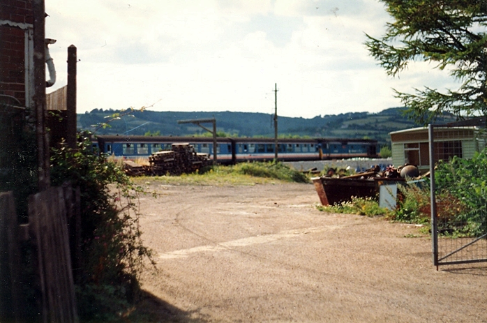 In the foreground is the vacated goods yard. The remains of the loading gauge were still apparent in 1990. In the background is a Class 50-hauled Waterloo to Exeter service. © Mike Glasspool