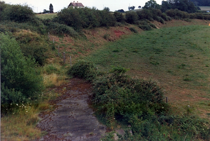 A south easterly view shows, in the foreground, the concrete of the branch line platform surface. The curvature of the branch can still be deciphered in this view: it formerly followed the foot of the embankment. © Mike Glasspool