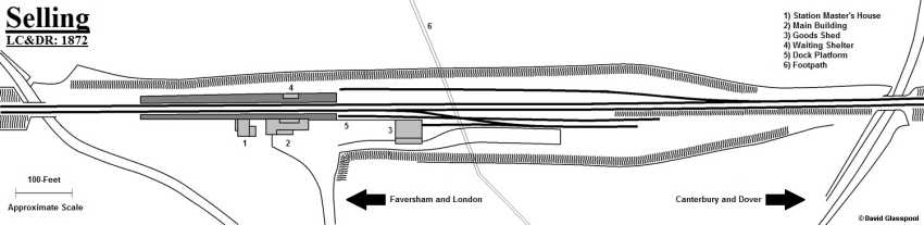 Selling was commissioned with two platforms, that serving London-bound traffic being host to the main building. This was a single-storey tongue-and-groove timber affair, featuring sash-style windows, all set upon a shallow brick base. The building's arrangement was such that it was essentially a timber version of the structure at Adisham, minus the latter's second storey. Slated pitched roofs were in evidence and the main building also sported an intricate canopy valance built to a standard LC&DR design (still a feature of Shepherds Well). On the ''down'' platform, waiting passengers were afforded a 30-foot-long timber waiting shelter. This comprised wraparound sides, a canopy valance, and was built to a standard design which came into use at sister stations at Adisham and Shepherds Well. Finally, a large property for the Station Master, two-storeys high, of creme brick construction and with sash-style windows, was erected midway along the "up" platform.