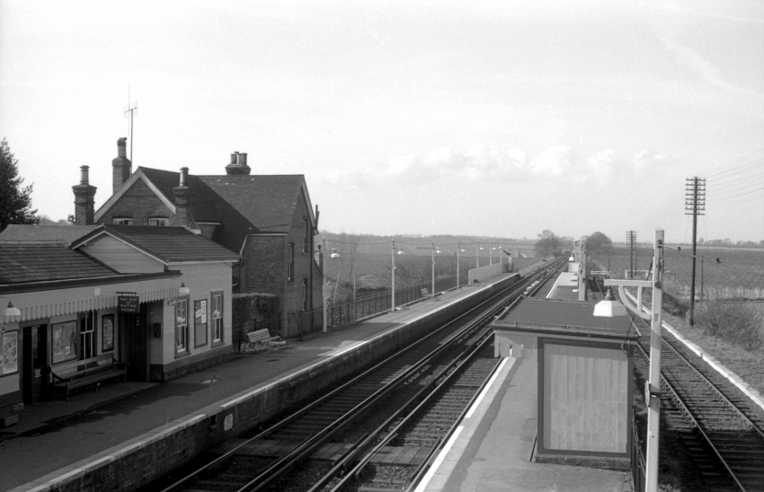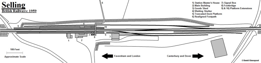 Selling resided on that section of the "Chatham" main line which was not subject to re-signalling as part of the 1959 electrification scheme, the accelerated timetable of which came into use on 15th June of that year. As a result, it retained its Saxby & Farmer cabin controlling semaphores and, additionally, an operational goods yard. The latter closed to public traffic on 5th November 1962 and the sidings on the "up" side were lifted. However, the lengthy "down" refuge siding, which passed behind the platform and under the footbridge, remained, as did the trailing crossover between the running lines.