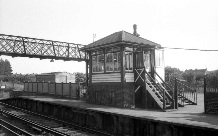 The attractive signal box, positioned at the Canterbury end of the “up” platform, was the product of well-known contractor Saxby & Farmer. Gutted by fire in January 1995 as a result of an arson attack, the main timber structure nevertheless survived to be reused at Eythorne, on the preserved East Kent Railway. The lattice footbridge, hexagonal lampshades, and SR concrete platform face and fencing complete this bygone scene. © David Glasspool Collection