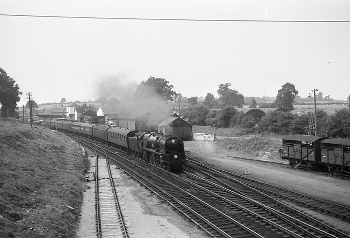 Merchant Navy Class No. 35025 "Brocklebank Line" is seen passing through Semley with a Plymouth to Waterloo service. "Warship" diesel hydraulics took over from steam traction on Waterloo to Exeter, and beyond, workings in the following month. In the background, it can be seen that the footbridge had lost its roof and that the main building - incorporating the Station Master's house - had a whitewashed finish. Behind the train's third carriage can be seen the signal box of 1961, whilst to the right of this is the goods shed; both of these structures and the main "up" side building remain in existence today. Paul Claxton / © David Glasspool Collection