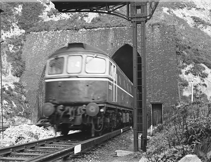 We first start with a bygone view from 1961, showing a Type 3 (Class 33) diesel exiting one of the gothic tunnel