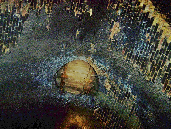 Now turning our attention to the ceiling, we observe a vent shaft and the tunnel's brick lining. Neighbouring