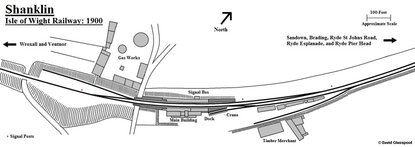As part of the alterations, the timber carriage shed was swept away, and in its place a small goods yard emerged. A northward-facing dock siding came into use behind the original platform, and across the yard could also be found a lengthy siding serving a timber yard. Both sidings made indirect connections with the Ventnor-bound running line, thus reversal manoeuvres into a long head shunt were required to gain access. South of the station, immediately beyond the road bridge, a siding was commissioned to serve the nearby gas works, and coal was conveyed from wagons to works by means of a chute running down the side of the embankment. From the outset, the line had been worked on the "staff and ticket" system, whereby the driver had to be in possession of a "staff" (a metal or wooden baton) in order to proceed along the single line. This was issued by the signalman or Station Master, and would be surrendered by the driver at the end of the line to permit another train to depart in the opposite direction. Should trains be required to follow one after the other in the same direction, drivers would instead be given a written ticket of authorisation from a signalman in possession of the staff, and be allowed to proceed along the single-track. In 1888, the "Webb-Thompson Electric Staff" system was invented by F.W. Webb and A.M. Thompson of the London & North Western Railway. This was implemented on the IWR from about 1893, and replaced the earlier "staff and ticket" arrangement. In brief, the electric staff system included signal boxes at either end of a single line (block section), in which the signalmen would communicate with each other electronically. Both signalmen together had to authorise the passage of a train over the single line in-between them, by the co-removal of a token from an interlocked machine at either end of the block section. Shanklin's layout was controlled from a Saxby & Farmer signal box positioned behind the canopy of the "up" platform, which operated an array of wooden-post semaphores.