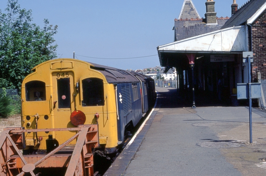 Class 485 No. 485045 is seen at a Shanklin station which had witnessed yet more rationalisation. The delightful "down" side canopy has lost its SR wrap-a-round end and been cut back to within the limits of the station building. The northern end of the canopy has also been removed, the signal box taken down, the second track lifted, and the "up" platform has disappeared under a sea of shrubs. Both platforms were demolished at their southern ends, permitting removal of the bridge span and the building of a brick wall and fence across the track bed, just beyond the new buffer stops. © David Glasspool Collection