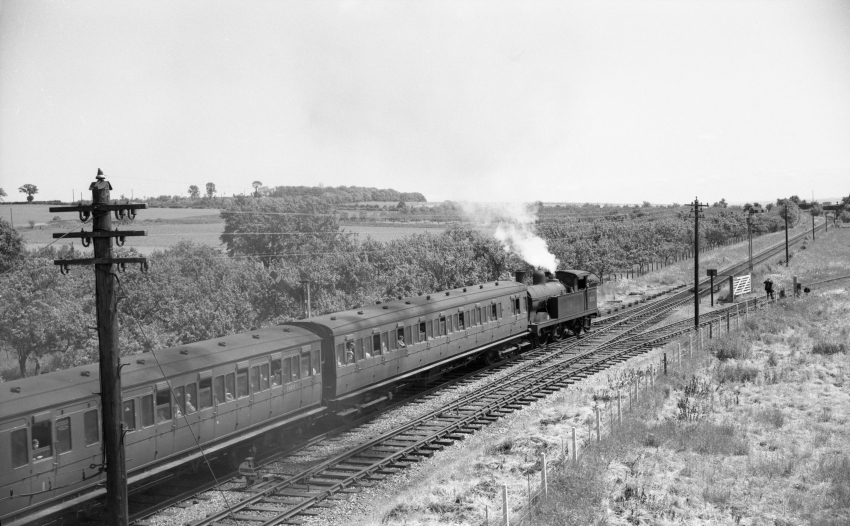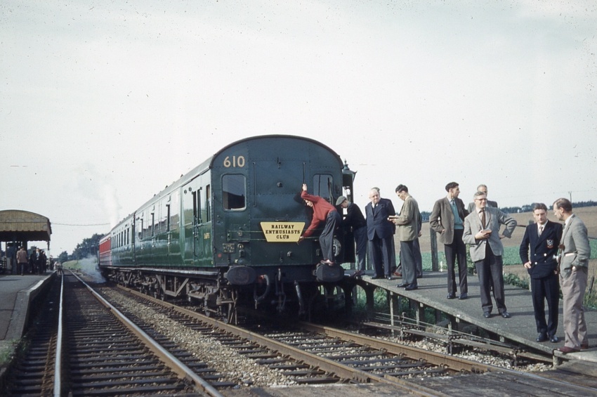 The arched canopy of the main building is in evidence on the left of this Hoo Junction-bound view, which shows "The North Kent Rail Tour", organised by the "Railway Enthusiasts' Club", during a brief stop. The tour had started at Gravesend Central and was scheduled to visit Allhallows-on-Sea, Grain, Tovil, Chatham Dockyard, and Sheerness-on-Sea branches, before returning to its point of origin. Push-pull set No. 610 — formed by a pair of Maunsell carriages — and an ex-SE&CR compartment carriage make-up the train, which at this stage was being propelled by "H" Class No. 31512. The ramp on the right is that of the prefabricated concrete platform erected by the Southern Railway. Below the ramp can be seen the cables from the signal box, whilst in the foreground is one of two track foot crossings — the second can just be seen in the distance. © David Glasspool Collection