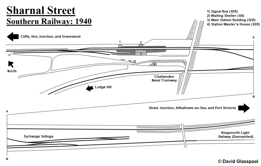 In 1901, a connection via a series of exchange sidings — owned by the Admiralty (ref: The Railway Magazine, March 1933) — was made between the SER’s line at Sharnal Street and the “Chattenden Naval Railway”. The latter is a subject in its own right and could fill a book; a detailed look at it would be too much of a digression for this section, which concerns the SER’s station. However, it is worth noting that the proposals for this two-mile-long standard gauge line, running between Lodge Hill and Sharnal Street, came to the fore in January 1901: