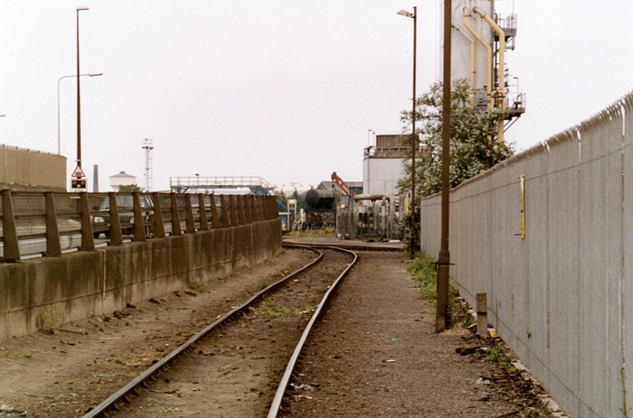 The single track branch wends its way up a slight gradient to the docks in this northward view, the edge of which is indicated by the palisade fencing on the left-hand side. The main products now imported here are brand new vehicles. © David Glasspool