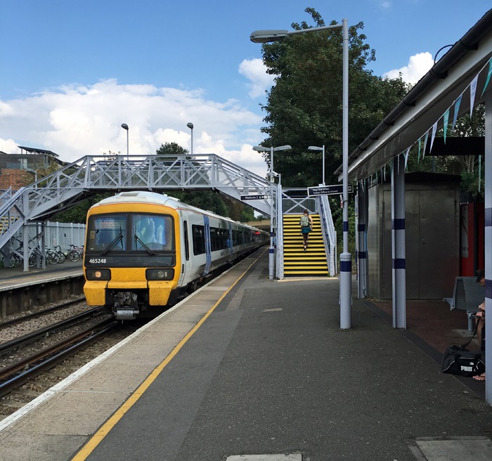 Lee is no longer the lone ranger in promoting the Dartford Loop Line's 150th anniversary and bunting has since appeared at Crayford, Bexley, and Mottingham stations. No. 465248 is seen coming into platform 1 at Crayford with a Charing Cross service, the bunting being evident on the right, hanging from the roof of the main building. © David Glasspool