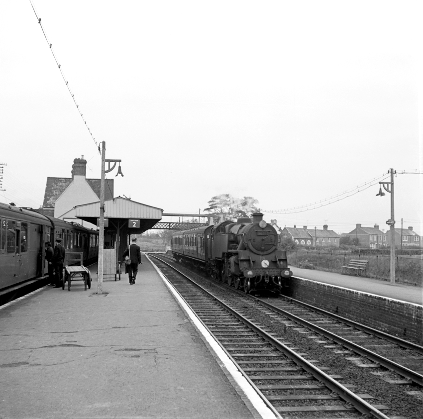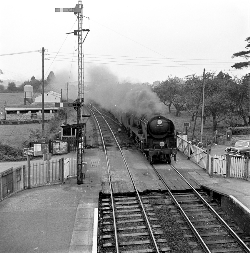 Merchant Navy Pacific No. 35004 “Cunard White Star” is seen passing over the level crossing that still exists today, London-bound. The presence of the canopy and footbridge necessitated the tall double-arm signal post, due to obscuring drivers’ views. On the left can be seen the “down” side gate box that had come into use in 1959, replacing one on the opposite side of the rails. A Vauxhall Velox is seen stopped at the crossing. © David Glasspool Collection