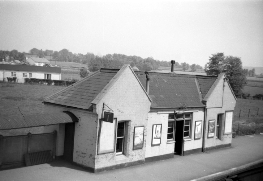 The “up” side masonry waiting shelter was of generous proportions and shared the Gothic air of the main building. It was built to a standard design, virtually identical examples coming into use at Broad Clyst and Whimple; timber versions of the design were evident at Axminster and Honiton. The 1950s cream paint was peeling from the “up” waiting shelter by the time of this view. Perhaps referring to this structure as a “shelter” is an injustice, because it was a substantial brick building. Note that the covered way of the footbridge was continued along the platform to meet the waiting room, so passengers remained protected from the elements. The grass field immediately behind the station would shortly be awash with housing, alas not soon enough to prevent the station’s closure. © David Glasspool Collection