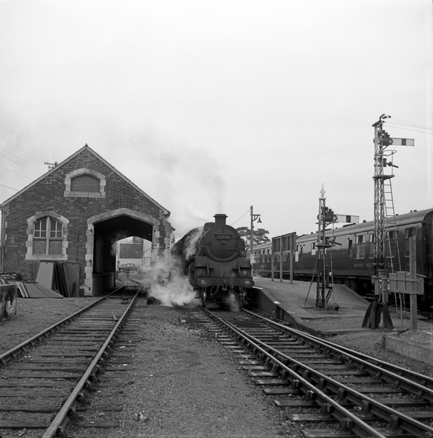 BR Standard Tank No. 80040 is seen in the “down” bay (platform 3) fronting the branch line service to Sidmouth. This Exeter-bound view affords an excellent view through the goods shed and of the kink in the siding that serves it. The goods shed was a standard design, sharing the same type of masonry as the main building, similar examples coming into use at neighbouring stations. Sparkling BR Mk 1 vehicles — one of which is a Buffet Restaurant Car — are seen rumbling into platform 1, possibly as part of the “Atlantic Coast Express”. Of the latter, there was a time when this train dropped coaches at Sidmouth Junction and, through a complex series of reversing manoeuvres, these were conveyed down the branch line. © David Glasspool Collection