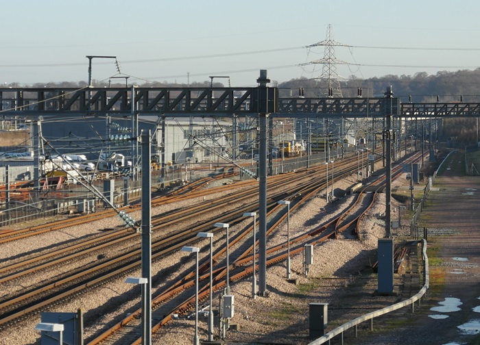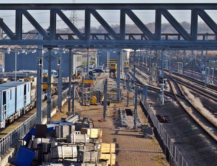 We have swapped sides and are now at the western end of the depot, looking east. The yard in view is host to a motley collection of components for MPVs (Multiple Purpose Vehicles) On the right are four tracks: the centre pair are those of the main line, whilst those flanking either side are the Singlewell Loops. © David Glasspool