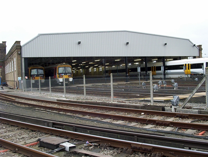 A general view of the shed shows Class 465 Nos. 465158 and 465034 on the left, with a Class 466 in a newer livery getting in on the act on the right. This is the ''London'' end of the building, dating from June 1954. © David Glasspool