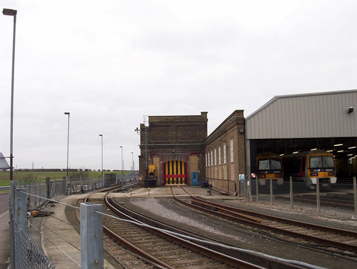 The entrance marked with a black and yellow striped door is that of the repair shed. Originally, the structure would have covered both the lines seen, whilst also extending forward until level with the building's frontage. The staff entrance road on the left-hand side occupies the site of a further siding which was reached by the southern of two former turntables. © David Glasspool