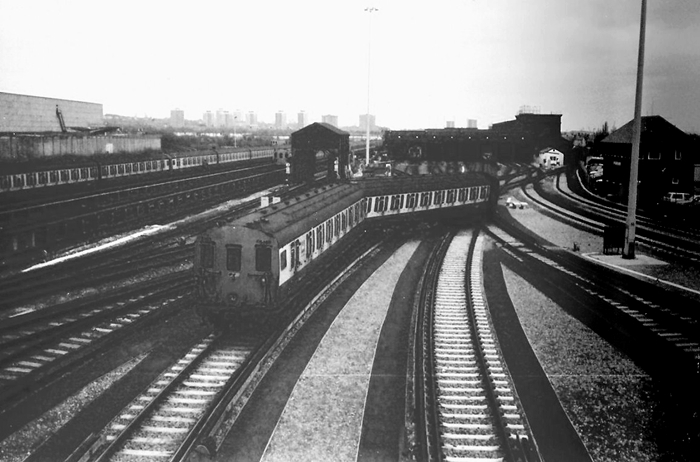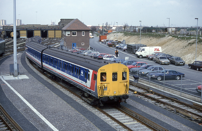 A staff footbridge was erected across the front of the new repair shed, and it is from here where this photograph is taken, again of the stricken 4-EPB. On the far right is the then new ''Slade Green Depot Control Room'', whilst to its left is the former engine shed. Within the latter can just be picked out a ''main line'' 4 CEP unit. At this time, main line stock from the Central Division arrived at the depot for seating refurbishment and wheel turning. There was also a regular main line service which ran from Faversham to Dartford, leaving around 23:15. From Dartford, the train proceeded empty stock to Slade Green and, the following morning, formed the 05:10 hours to Dover Priory. © Colin Relf
